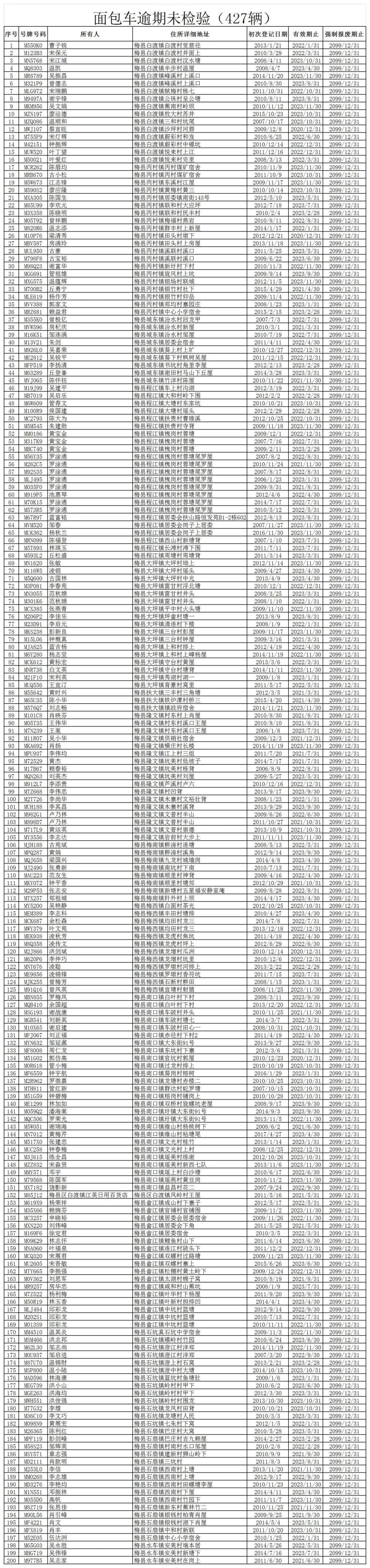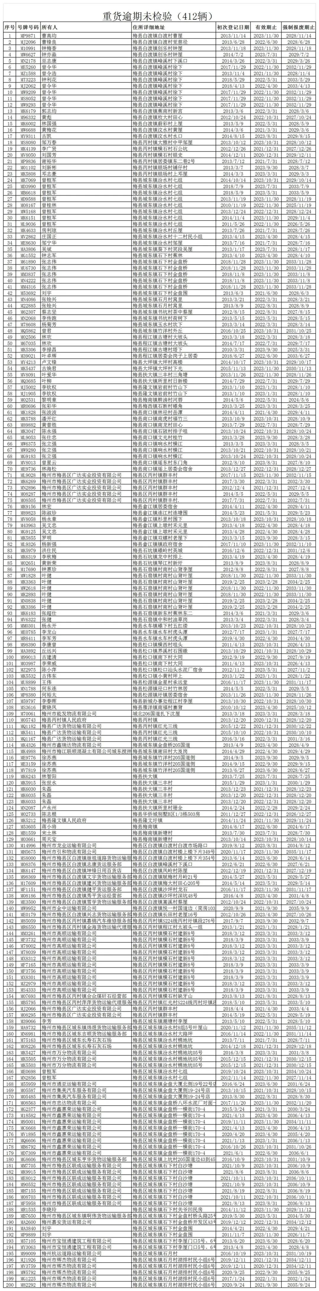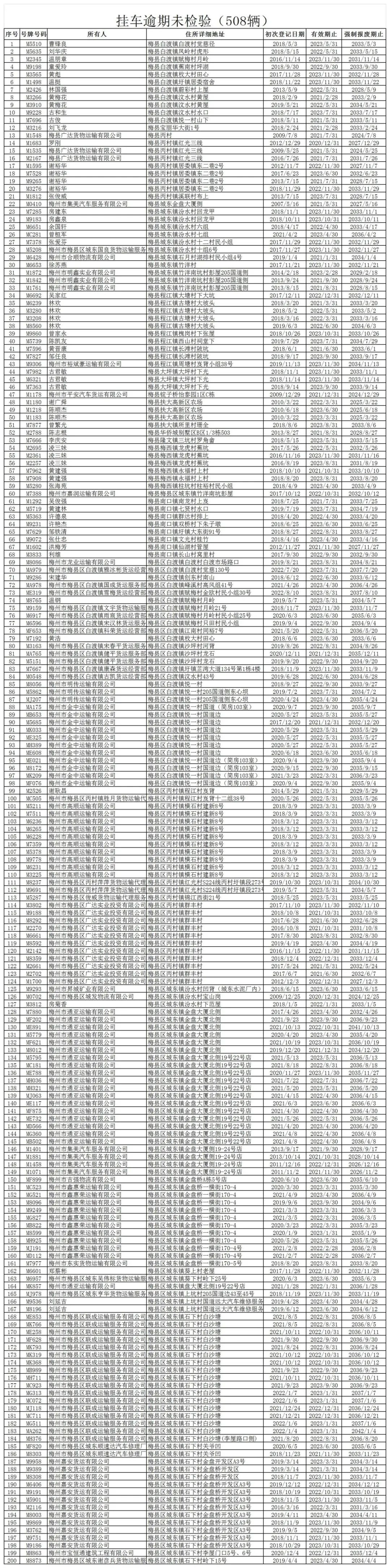 為消除道路交通安全隱患,推進(jìn)源頭隱患治理,有效預(yù)防和遏制重特大道路交通事故的發(fā)生。近日,梅縣區(qū)公安分局交通警察大隊(duì)對重點(diǎn)車輛進(jìn)行了全面排查,為及時消除安全隱患,特對逾期未檢驗(yàn)車輛進(jìn)行曝光(如已辦理相關(guān)業(yè)務(wù)的可忽略此信息)。