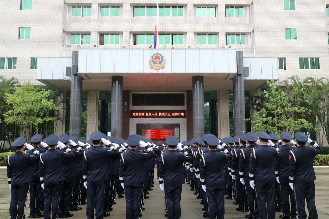 隨后,在機(jī)關(guān)大院內(nèi),民警列隊(duì)整齊,莊嚴(yán)肅立。伴隨著雄壯的《中國(guó)人民警察警歌》,一面紅藍(lán)兩色組成的警旗緩緩升起?!皞ゴ蟮淖鎳?guó)賦予我使命,復(fù)興的民族給予我力量……”跟隨著雄壯嘹亮的警歌,列隊(duì)民警面向警旗肅立、敬禮,齊唱警歌。