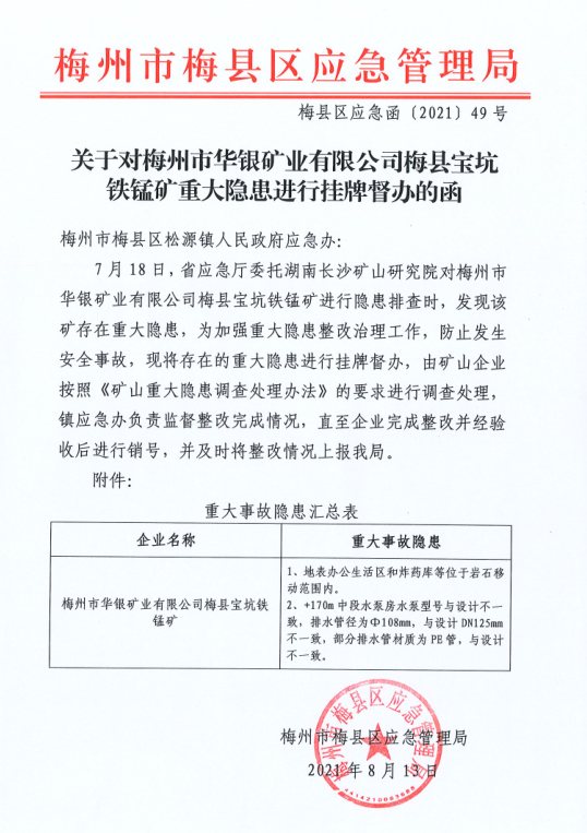 關(guān)于對(duì)梅州市華銀礦業(yè)有限公司梅縣寶坑鐵錳礦存在重大隱患進(jìn)行掛牌督辦的函
